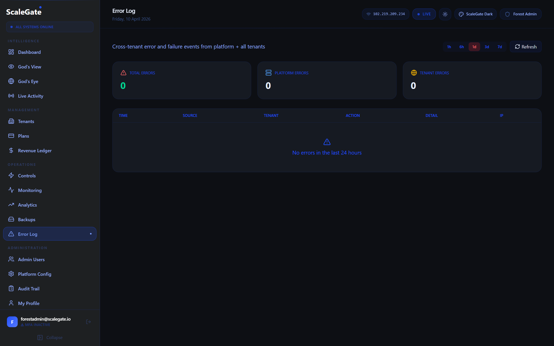 Below the KPIs is a table with columns Time, Source, Tenant, Action, Detail, and IP. Currently empty: "No errors in the last 24 hours" — which is exactly what you want to see.